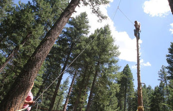 A 20’ pole that the participant climbs while wearing appropriate safety gear, harness and being on belay. The participant then jumps off the pole and is belayed to the ground.